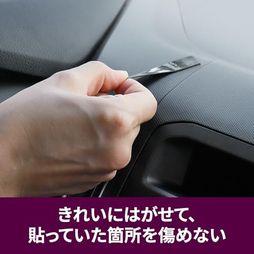 幅15mm、長さ3mと使い勝手の良いサイズで、ダッシュボードへの貼り付けに特化した設計により、多様な素材にも強力に接着しながらも、取り外しの際にはキズをつけずに剥がせるというバランスが魅力です。