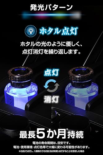 • 長時間持続する電池寿命: 電池式で、常時点灯でも約2か月、ホタル点灯モードなら約5か月とバッテリーの交換頻度が少なく経済的です。